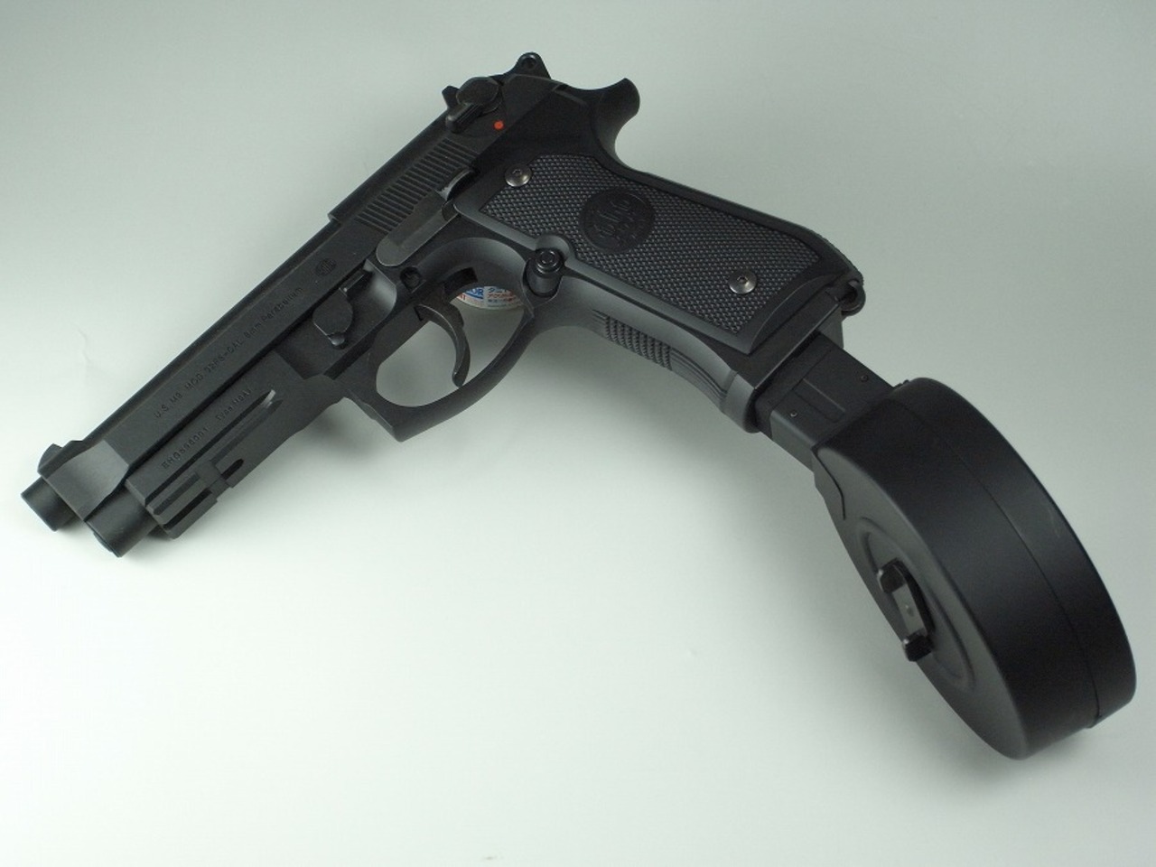 電動ハンドガン M9A1の30連ノーマルマガジンとMP5用400連ドラムマガジンを無加工で接続するためのパーツです。