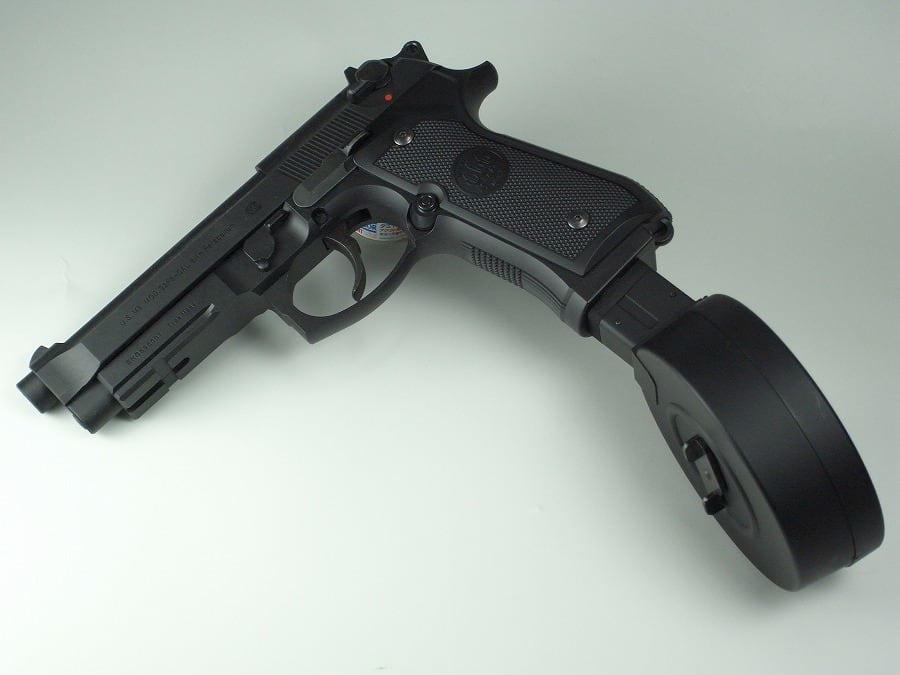 簡単な作業で誰でも電動ハンドガンにドラムマガジンを装着することが可能となります。